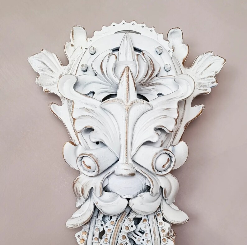 Painted with a mat white laquer and gold wax paste. Protected with clearcoat mat lacquer. Weighing just over 5.5 kg or 12 pounds. All it needs is one hook to mount it on the wall.